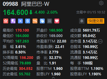 阿里巴巴港股股价回落,跌近3%,触及164港元尚红网,此前一度转涨;美股夜盘跌近1%,此前一度涨超2%。截至发文,阿里巴巴跌2.6%,成交额逾95亿港元。